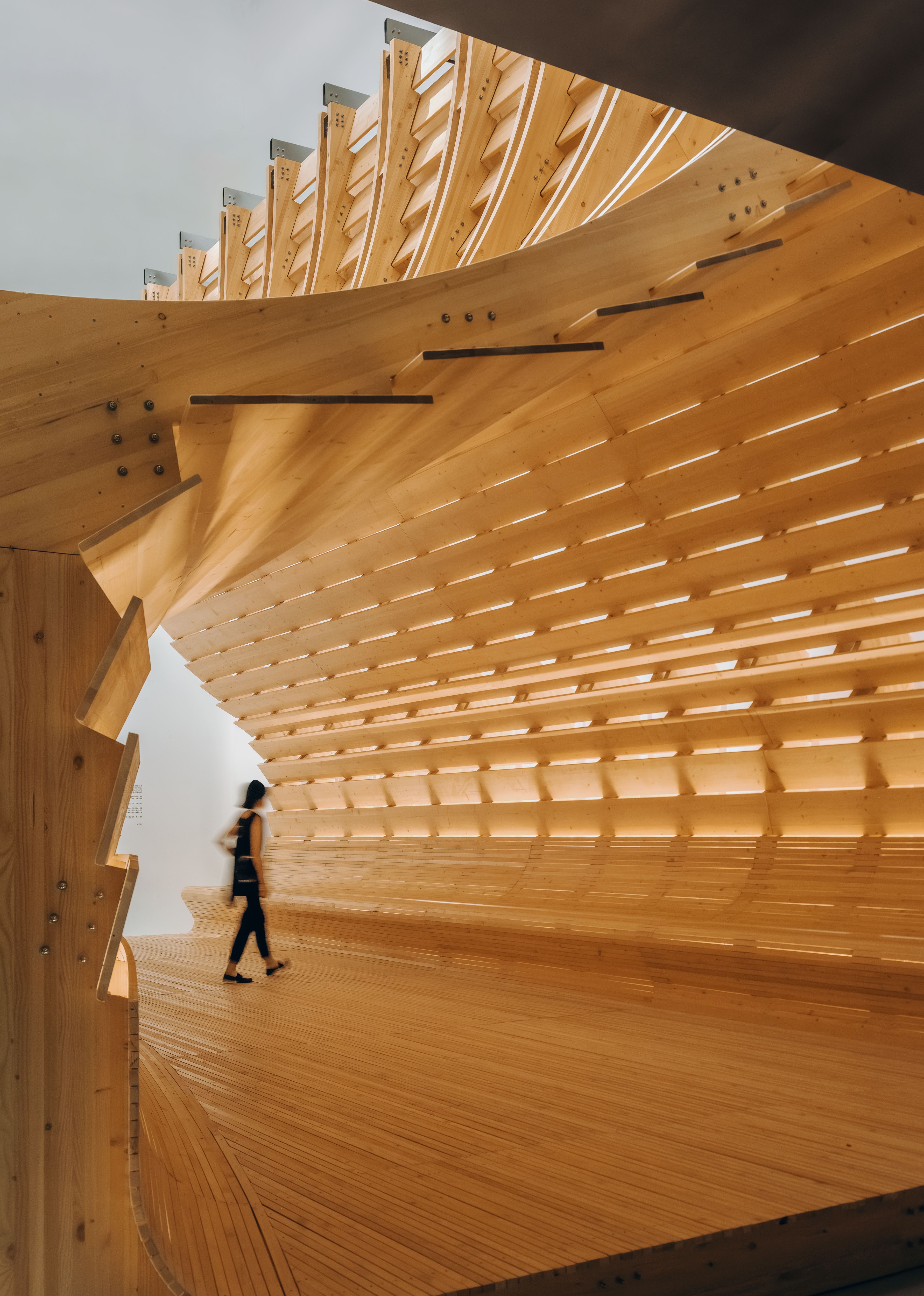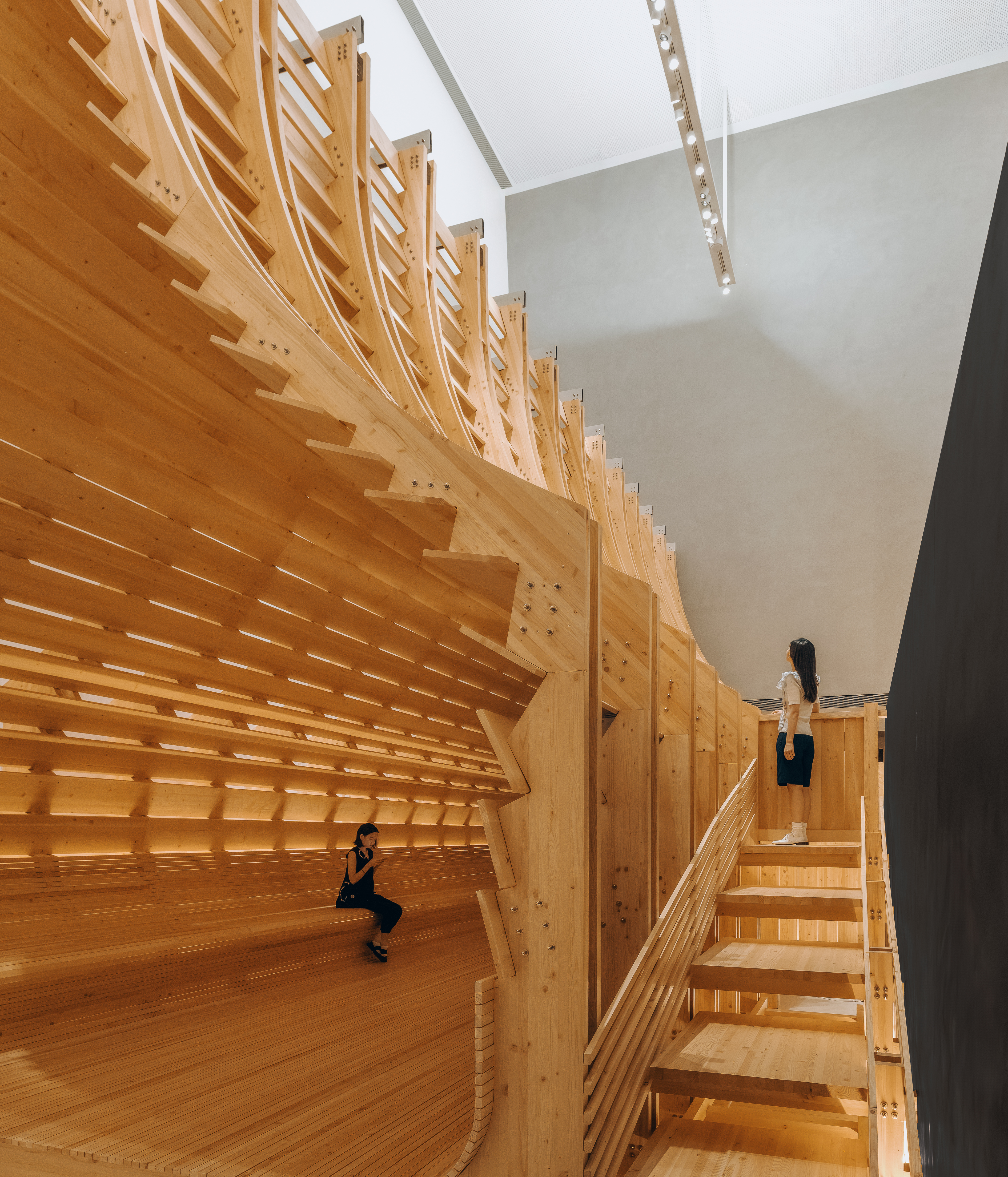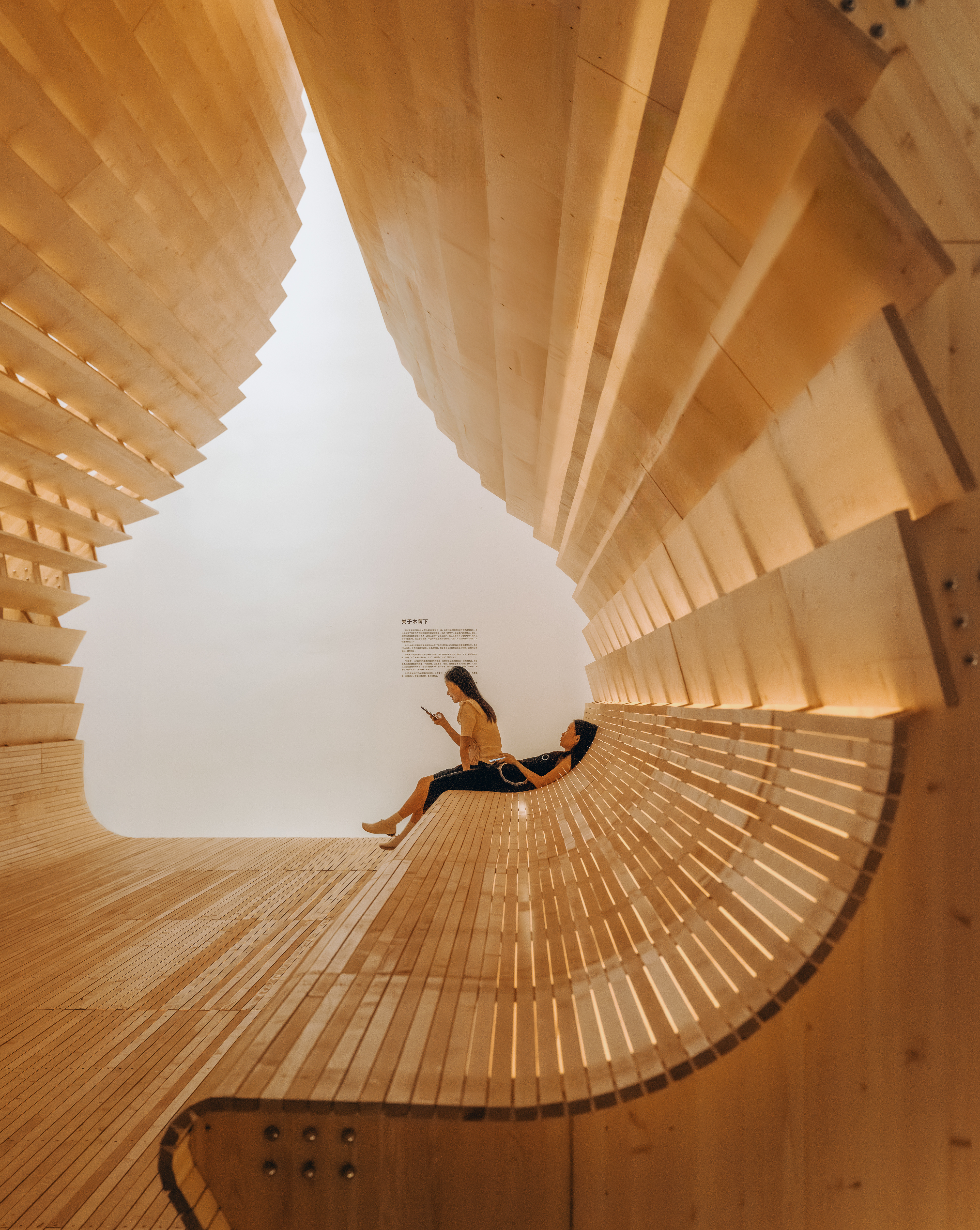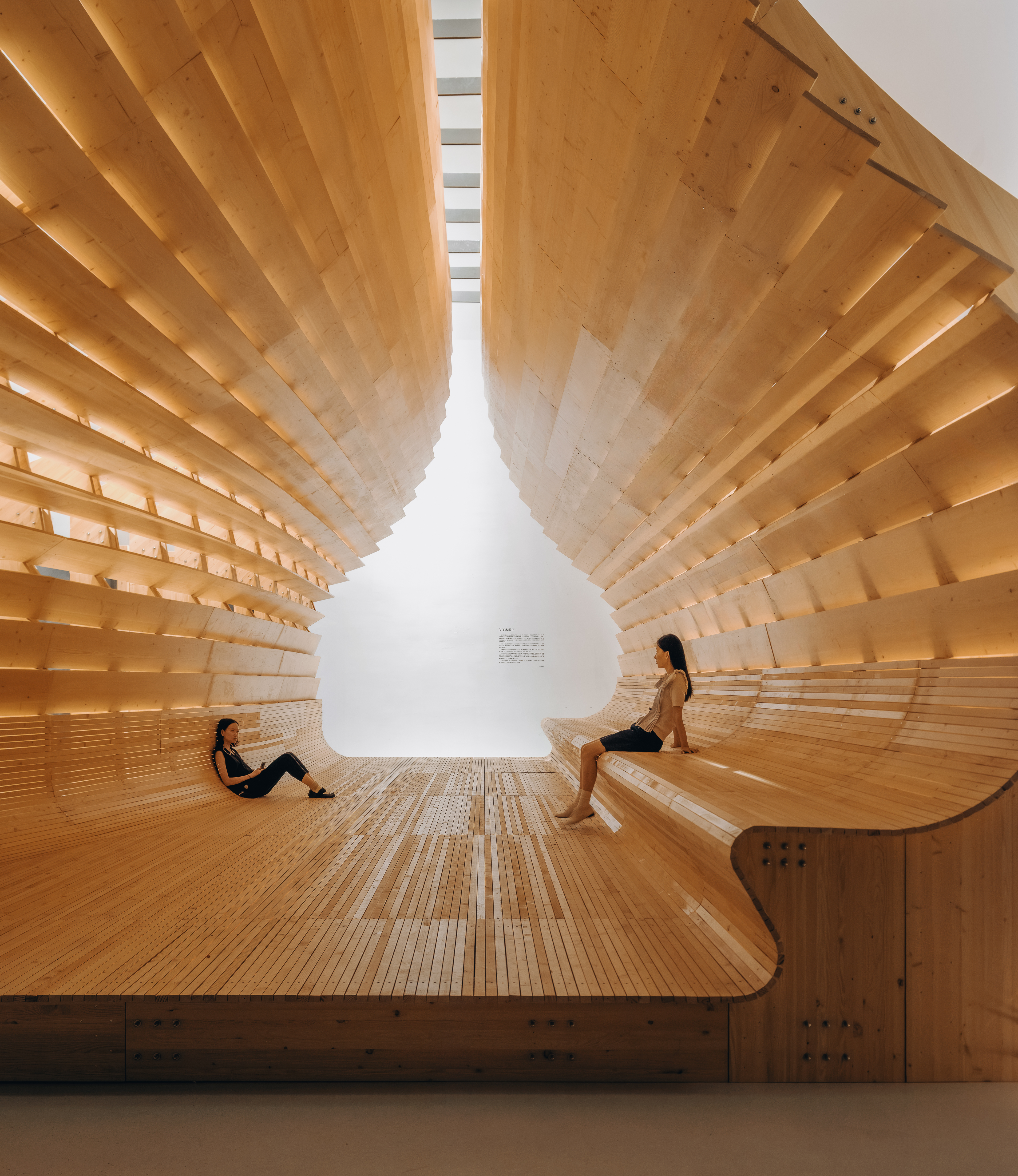 “Timber Shade” draws from the layered form of traditional timber construction, using mortise-and-tenon joinery to create an architectural installation with an open top and layered side walls that allow filtered light to penetrate. From within, it resembles a corridor or a granary, offering a sense of shelter and refuge. Visitors may recline freely on the floor or lean against long benches. From the outside, the vertical supporting lattice echoes traditional wooden columns, while the layered timber elements resemble tiled roofing, evoking the eaves of a pavilion or the form of a hall…