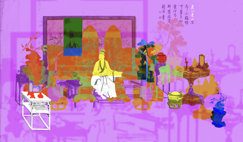 Curator Yang Zi believes that “Shi Yi Shi Er (One or Two); Neither Sameness nor Difference” symbolizes the recursive questioning of art towards itself, and “Confucianism or Mohist School” points to the political proposition of tolerance and coexistence among civilizations. In the painting of Emperor Qianlong, there hangs another portrait of him, which seems to prove the existence of the emperor’s image and is seen as an illusory representation. If the self is just an illusion, what are the “concerns” about it?