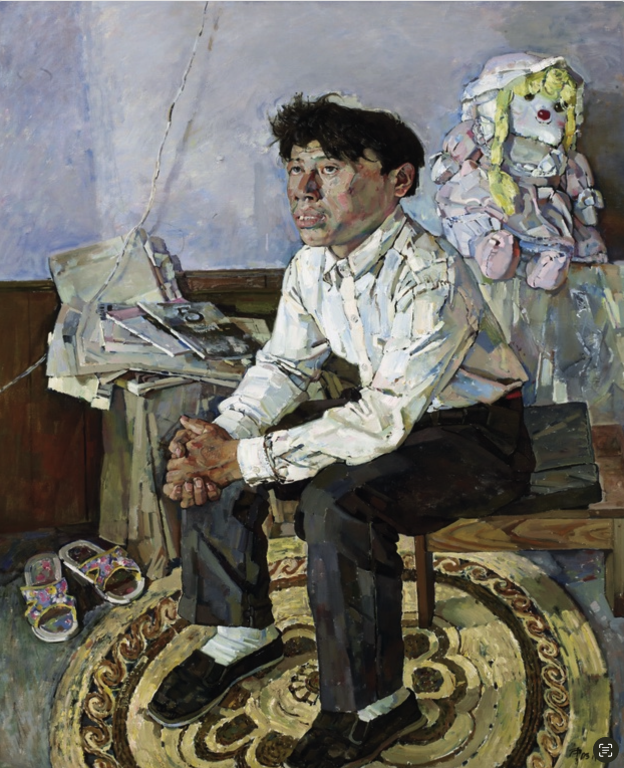 据忻东旺的夫人张宏芳回忆,《客》描绘的是艺术家的一位远房亲戚,名叫建军,当时要进城找工作,到忻东旺家里求助。艺术家对人物的深刻理解,通过建军蓬乱的头发,拘谨无措的身体姿态与表情、衣着的细节,表现的淋漓尽致。驻足画前,观众仿佛能感受到建军呼吸中的窘迫,嗅到他身上的汗味。忻东旺对建军的描绘,给人以巨大的情感冲击,同时以人性的温暖和真实的交流表达,化解社会发展给人带来的尴尬。