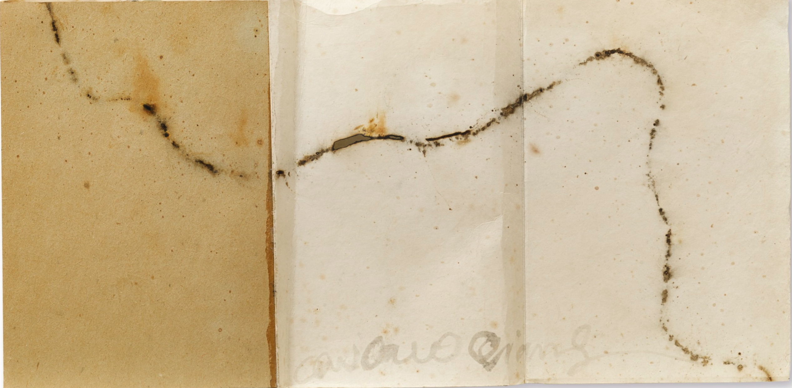 1993年2月,蔡国强在甘肃嘉峪关以西的戈壁荒漠里,沿着长城的西端布置了10公里长的火药导火线,于黄昏时分引燃。这条长达一万米的火龙在戈壁滩上熊熊燃烧了约15分钟,远远望去宛如长城的延伸,场面极其震撼。这一惊世之举被命名为“万里长城延长一万米:为外星人作的计划第十号”。蔡国强以长城和火药这样典型的中国符号,创造出面向宇宙的艺术宣言。这幅1994年的手稿,其实是把那次爆炸现场的火焰痕迹“定格”在了纸上。火药在纸上炸开的痕迹,黑灰交织,如飘渺云烟,又如历史烧灼的印记。这种跨媒介融合令人耳目一新,在90年代的当代艺术中是非常前沿的尝试。今天再看这份手稿,它既是一件精美的艺术品,也记录了一场不可复制的艺术实践。