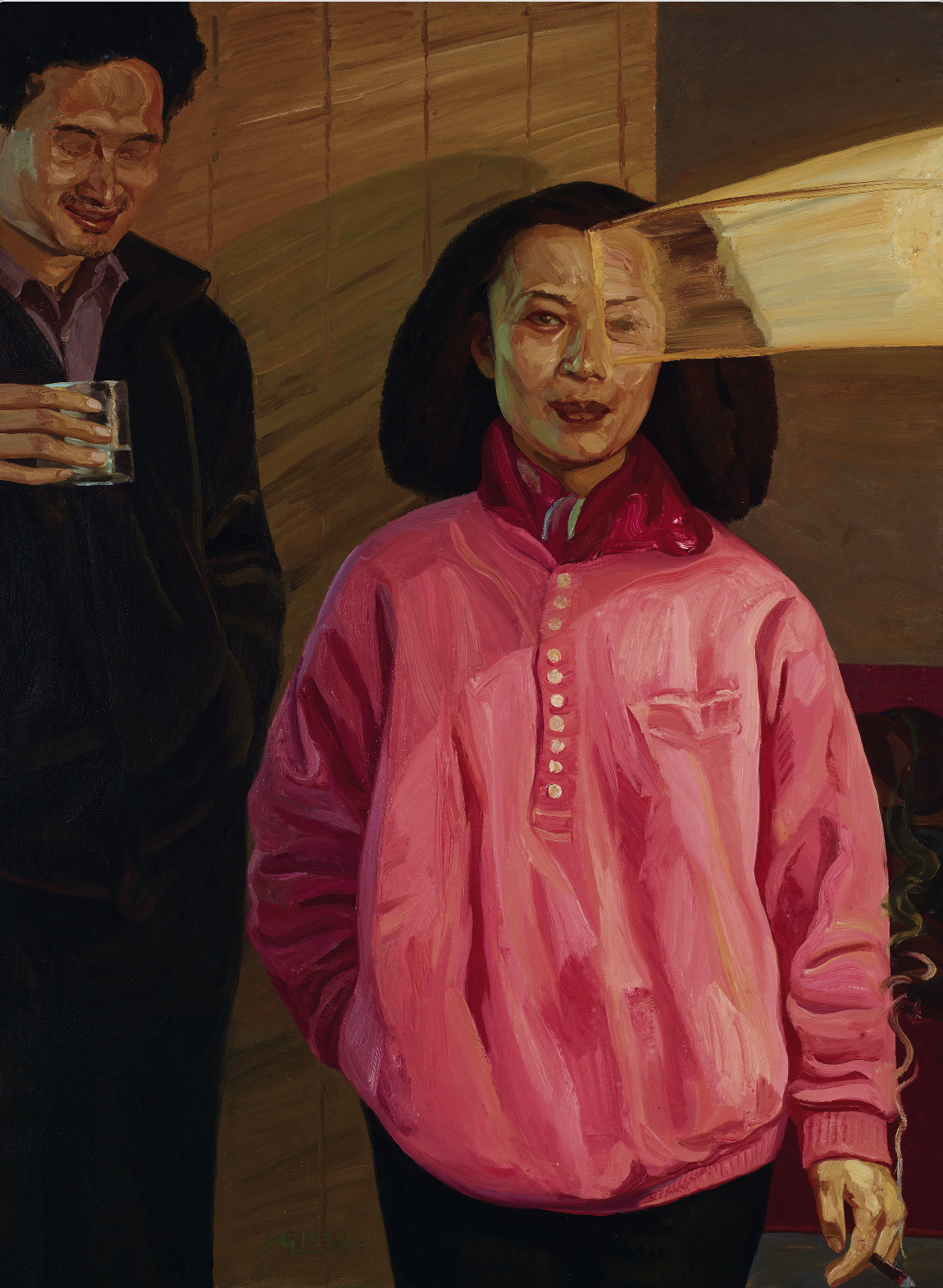 刘小东从日常生活入手,以朋友为模特的创作了这幅“爱情”主题的作品。画面中,人物的服装、发型,甚至油彩风格都是对上世纪八九十年代的精准再现。作品的构图以求婚的两各人为主体,不强调形象的完整性,而更多是把一种类似于电影定格的瞬间感凸显出来,男青年略带紧张的神情,以及女青年若有所思、似有预感的面容,成为作品最引人瞩目的表达。此外,画面中保留了一束明显超越写实的寓言、充满象征和表现意味的光,照到女青年的脸上,仿佛是对未来时间的一种预示。